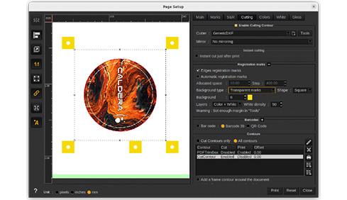 Die Funktion „Weiß unter Marken“ wurde entwickelt, um die Schneidegenauigkeit auf allen Arten von nicht-weißen Medien zu verbessern. Beim Druck auf dunklen, transparenten oder metallischen Substraten und wenn der Drucker über weiße Tinte verfügt, fügt CalderaRIP weiße Tinte unter und um die Schneidemarken und Codes herum hinzu, um die Erkennung der Schneidevorrichtung zu verbessern.